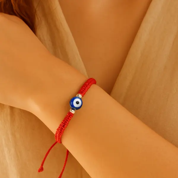 El ojo turco semiplano está acompañado de delicadas bolas de acero de 4 mm y tejido en hilo encerado resistente. Es ajustable, lo que permite adaptarla fácilmente a cualquier muñeca.